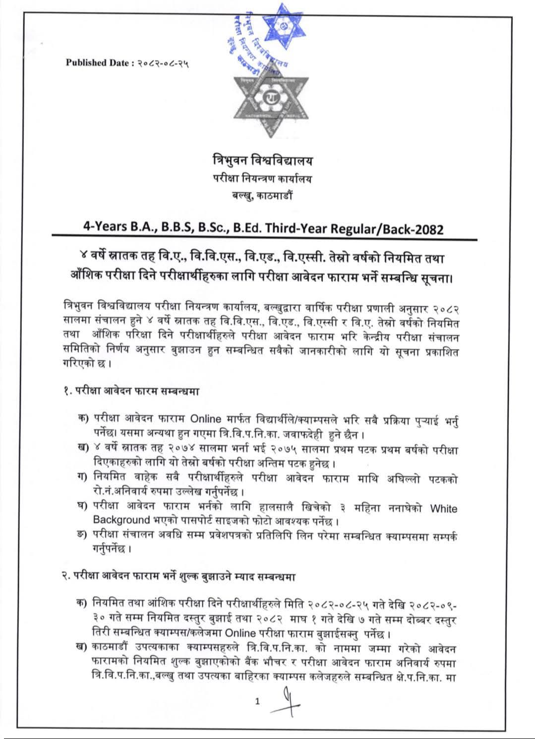 बिबियस तेस्रो वर्षको परीक्षा फारम भर्ने सूचना